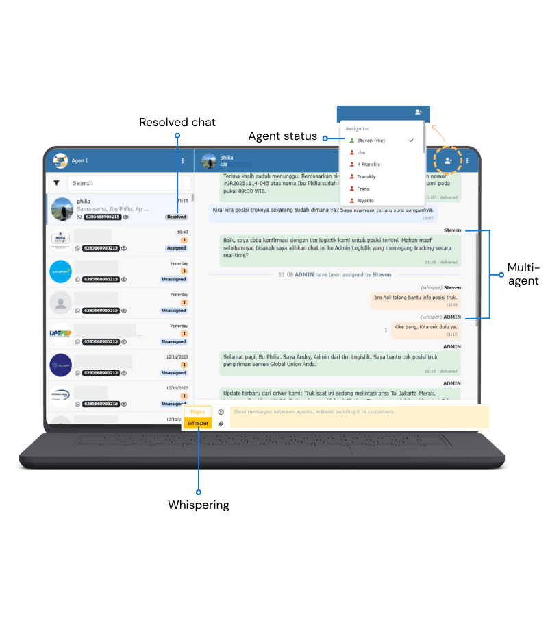 - Multi-Agent di Satu Nomor: Seluruh tim dapat melayani pelanggan dari satu nomor WhatsApp secara bersamaan.